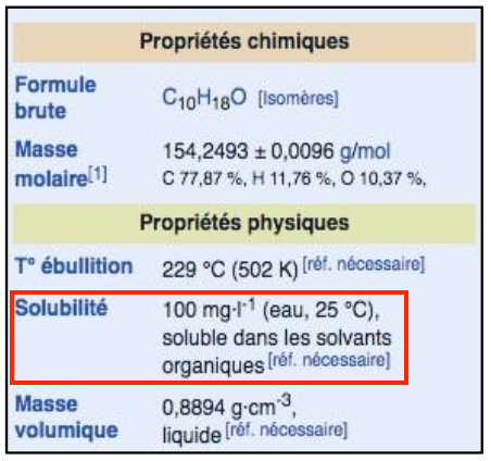 Remarque : Le sujet demande de prévoir (à partir des résultats des questions précédentes). Les données fournies contredisent nos prévisions : elles indiquent que le géraniol est très faiblement soluble dans l’eau, mais soluble dans des solvants organiques. D’ailleurs, l’énoncé mentionne dans le paragraphe précèdent la question 8 « la phase organique qui contient le géraniol », ce qui confirme sa meilleure solubilité dans la phase organique.