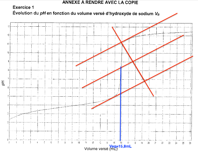 Avec la méthode des tangentes parallèles on trouve : $V_{eq} = 15,8\ mL$.
