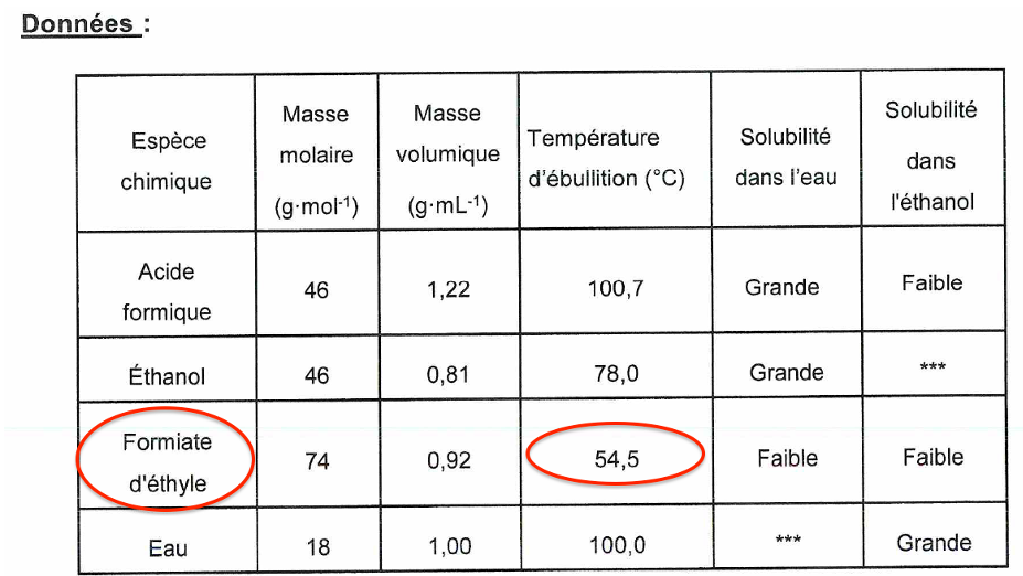 $\rho_{\text{formiate d’éthyle}} = 0,92\ g.mL^{-1}$