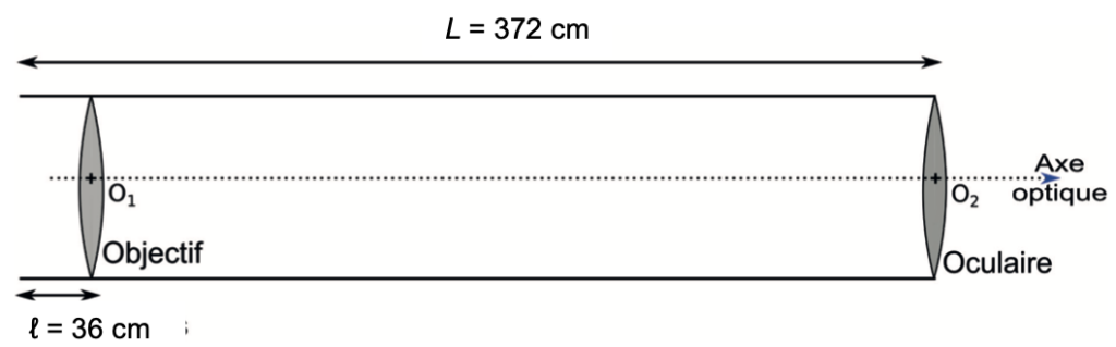 La lunette de Huygens est constituée d’un tube long de 372 cm. Comme indiqué sur la figure 4, l’oculaire est placé à une extrémité du tube. L’objectif quant à lui est enfoncé de 36 cm par rapport à l’autre extrémité, afin de le protéger de la buée.