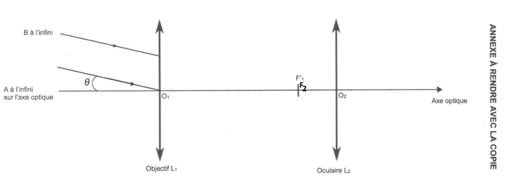 Sur la figure A1 de l’ANNEXE À RENDRE AVEC LA COPIE, réalisée sans souci d’échelle, sont représentées les deux lentilles et la position du foyer image F1’ de la lentille L1. La lunette est utilisée pour observer un objet AB, supposé « à l’infini », dont l’image par l’objectif sera notée A1B1. Deux rayons lumineux issus de B sont représentés sur le schéma.