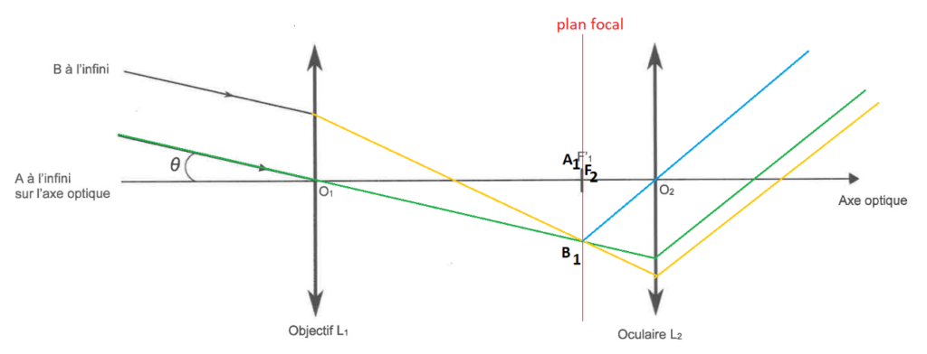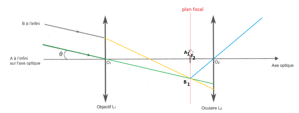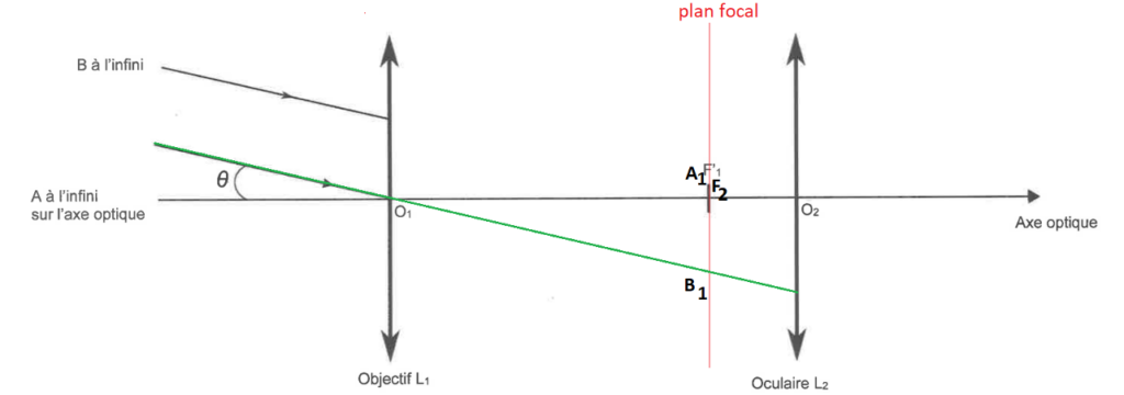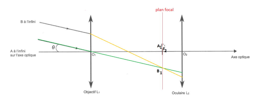 La lentille L1, donne de l’objet $A_\infty B_\infty$, une image $A_1B_1$ sur le plan focal.
