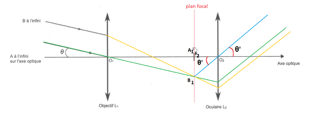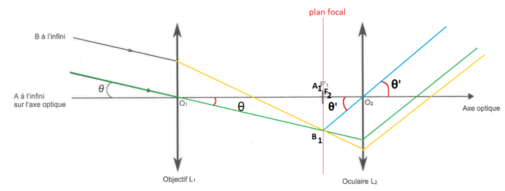 $\theta^\prime$ est l’angle sous lequel est vue l’image finale en sortie de lunette.