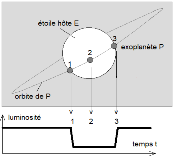 Une exoplanète peut être détectée par la méthode du transit planétaire qui consiste à mesurer régulièrement la luminosité d’une étoile afin de détecter la baisse périodique de sa luminosité. Cette baisse de luminosité est associée au passage par rapport à l’observateur d’une exoplanète devant l’étoile (figure 1 et figure 2 ci-dessous).