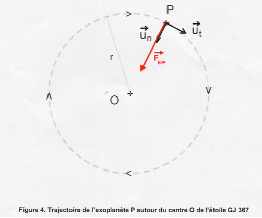 Dans le référentiel de l’étoile E, supposé galiléen, on considère que l’orbite de l’exoplanète P est circulaire, de centre O (centre de l’étoile) et de rayon r. La masse de l’exoplanète est notée mP.