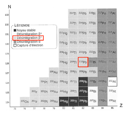 D’après le diagramme (Z,N) de la figure 1, le plomb-210 subit une désintégration β−.