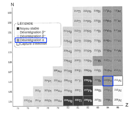 D’après le diagramme (Z,N) de la figure 1, le polonium-210 subit une désintégration α.