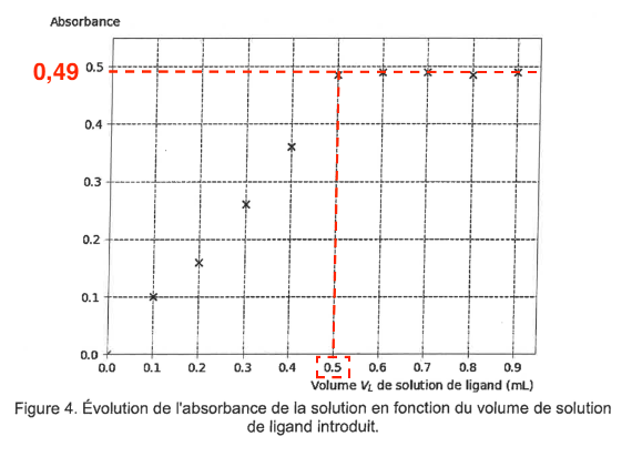 Q15. À l’aide de la figure 4, déterminer le volume Vtot,L de solution de ligand versé pour que l’ensemble des ions argent Ag+ (aq) présents aient réagi en quasi-totalité. Calculer la quantité de matière de ligand nL à introduire.