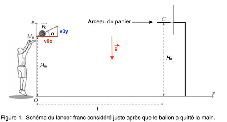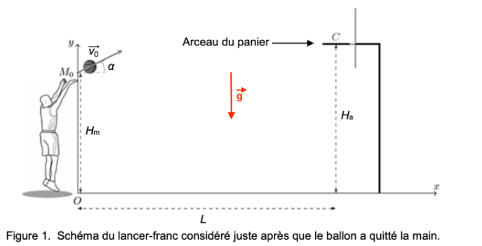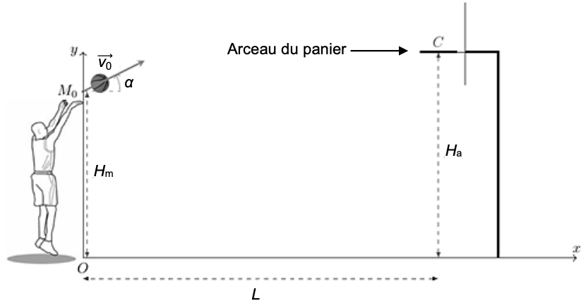 Quand le ballon quitte la main du joueur, son centre de masse M est situé à une hauteur Hm = 2,30 m par rapport au sol et à une distance horizontale L = 4,6 m du centre C de l’arceau du panier (figure 1).