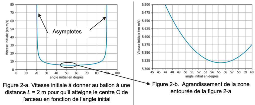 On souhaite comparer cette vitesse à celle qu’un joueur situé à une distance L = 2 m du panier doit communiquer au ballon. On trace sur les figures 2-a et 2-b la vitesse initiale à donner au ballon pour qu’il passe par le centre C de l’arceau du panier en fonction de l’angle initial α, pour la distance L = 2 m.