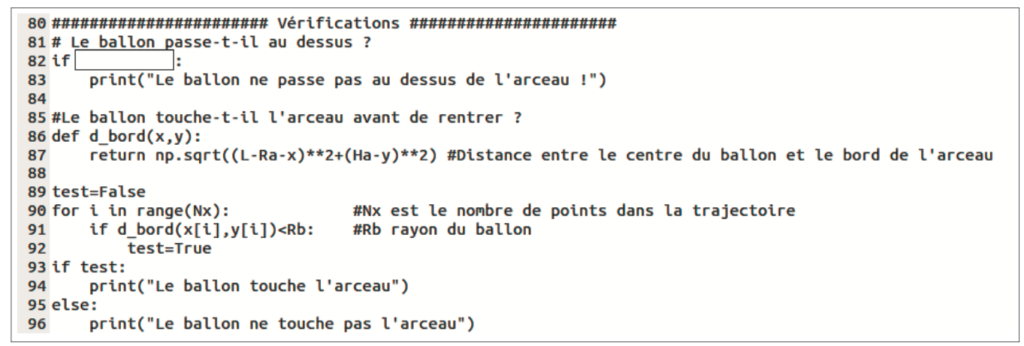 La figure 3 présente un extrait du code qui permet de vérifier que le ballon rentre bien dans l’arceau, dans le bon sens et sans le toucher. Le début du code (non représenté avant la ligne 80) permet de calculer la trajectoire passant par le centre C de l’arceau pour un angle initial donné, selon l’étude réalisée en première partie. Pour une trajectoire donnée, les coordonnées du centre de masse du ballon sont stockées dans les tableaux (aussi appelés listes) x et y. Les valeurs de x sont comprises entre 0 et L.