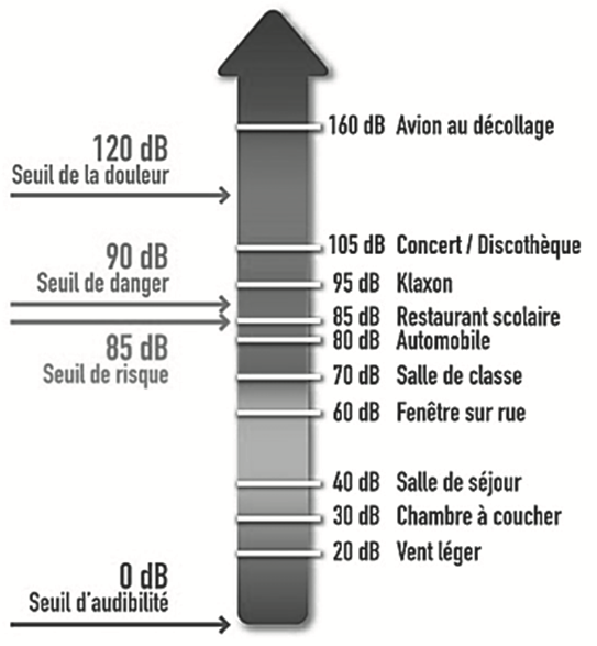 Figure 5. Échelle des niveaux d’intensité sonore perçus par l’oreille (source mur-silenzo.com)