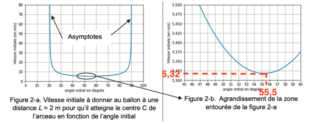 Q7. Déterminer graphiquement l’angle initial à choisir pour communiquer au ballon la vitesse initiale minimale lui permettant de passer par le centre C de l’arceau, si le joueur est placé à la distance L = 2 m. Comparer les valeurs de l’angle et de la vitesse ainsi trouvées à celles obtenues pour un lancer-franc. Commenter.
