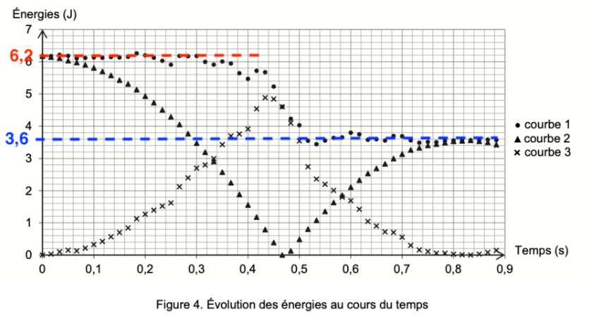 Q12. Parmi les courbes 1, 2 et 3 de la figure 4, identifier celles qui représentent l’évolution de l’énergie cinétique, de l’énergie potentielle de pesanteur et de l’énergie mécanique. Justifier chacune de ces identifications.