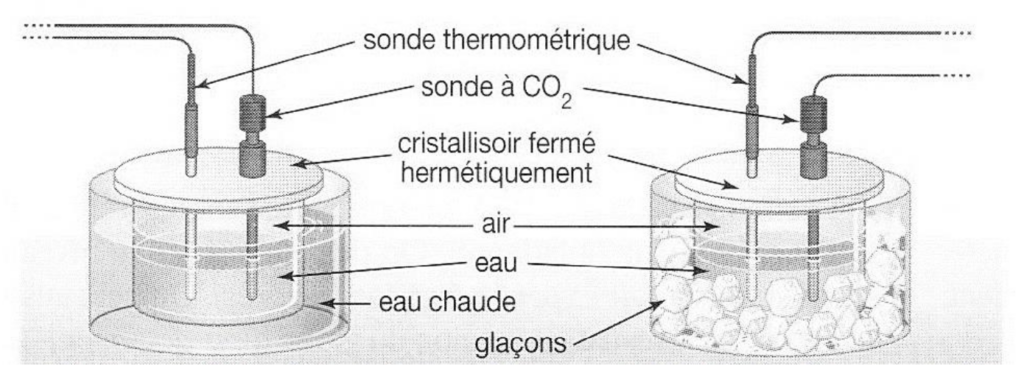 Pour estimer la solubilité du CO2 dans l’eau à différentes températures, on verse 150 mL d’eau dans un cristallisoir fermé hermétiquement et muni de deux sondes immergées permettant de mesurer le taux de CO2 et la température en continu.