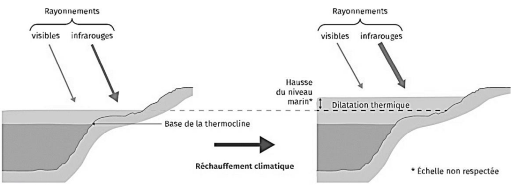 Ainsi, une augmentation de température des eaux océaniques entraîne une augmentation de leur volume. Ce phénomène est appelé dilatation thermique.