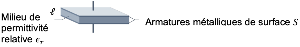 La capacité d’un tel condensateur est exprimée par la relation suivante : $C=\frac{\varepsilon_0,\varepsilon_r,S}{\ell}$ .