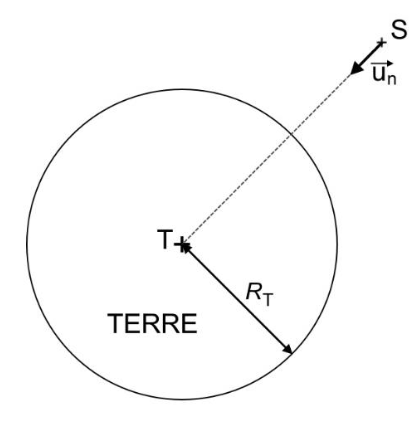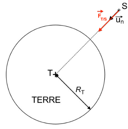Q.5. Exprimer la force d’interaction gravitationnelle $\overrightarrow{F_{T/S}}$ que la Terre exerce sur le satellite, en fonction notamment du vecteur unitaire $\overrightarrow{u_{n}}$ , de la masse de la Terre MT, de la masse du satellite MS, du rayon de la Terre RT et de l’altitude h.