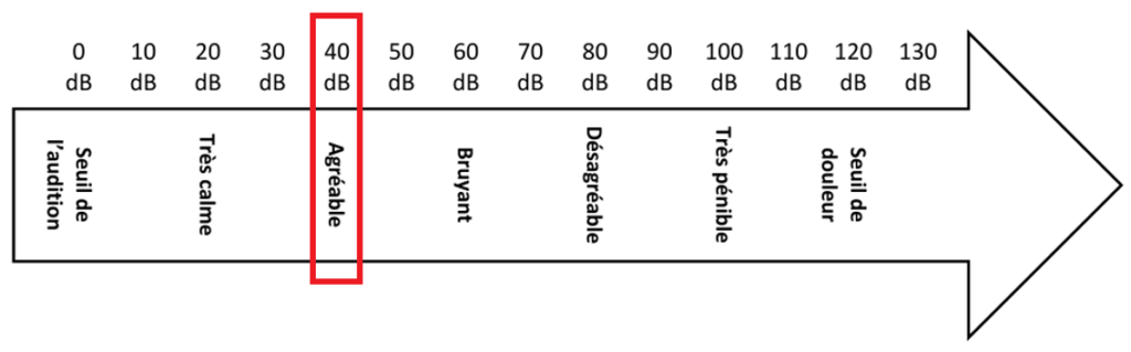 Pour une personne ne subisse pas de gêne liée au bruit du haut-parleur, le bruit doit être agréable soit 40 dB.