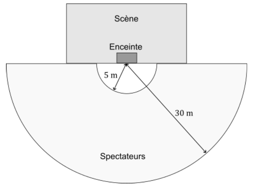 Lorsque les musiciens jouent, le son des instruments est amplifié et diffusé par des enceintes. Pour simplifier, on considère que l’ensemble des enceintes équivaut à une unique enceinte positionnée au centre du demi-disque.
