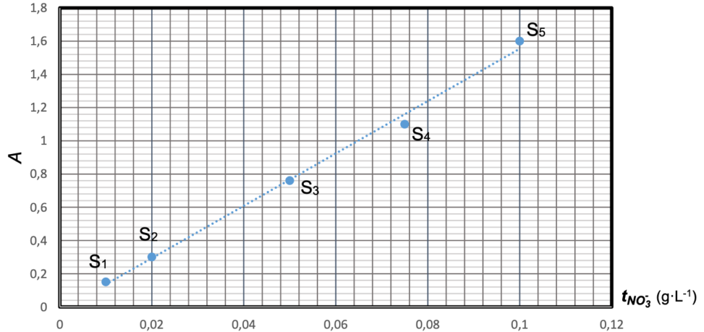 l judicieusement choisie, puis on trace le graphe de l’absorbance A en fonction de la concentration en masse en ions nitrate tNO3(figure 1 ci-dessous).