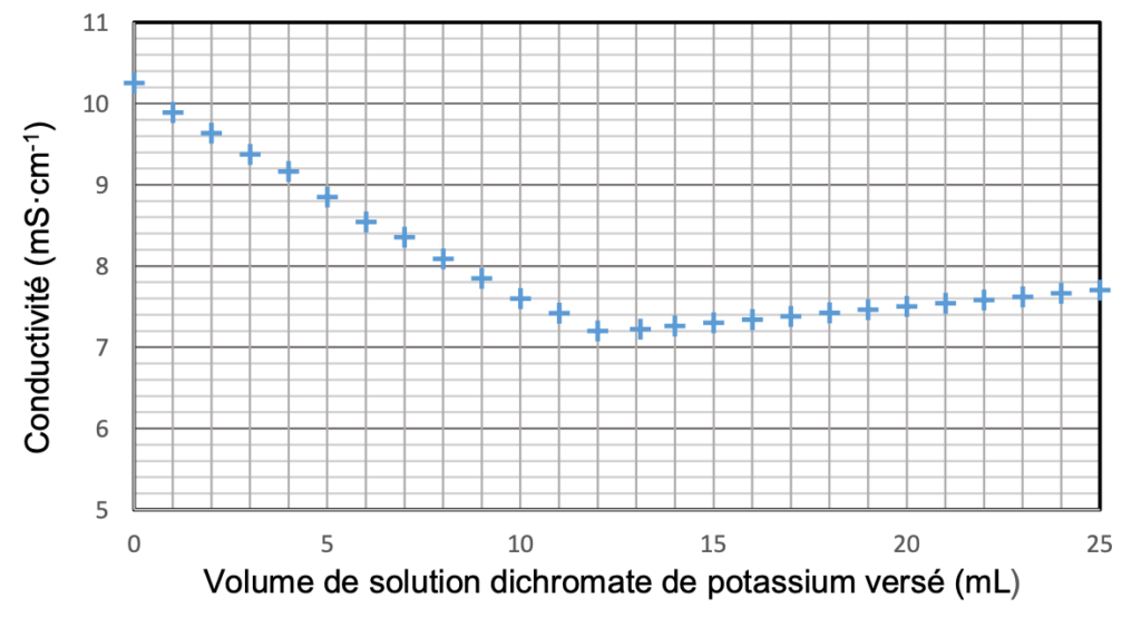 On titre ensuite les ions Fe2+ en excès (qui n’ont pas réagi précédemment) à l’aide d’un dosage par titrage conductimétrique : c’est l’étape 2.
