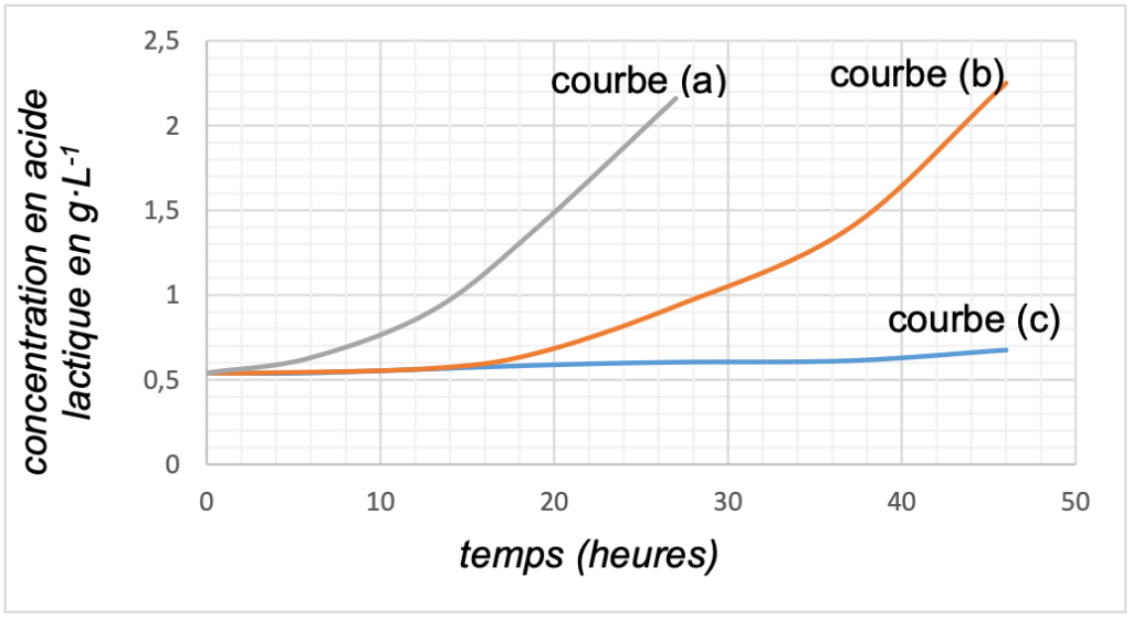 Un suivi par titrage a permis de déterminer la concentration en masse d’acide lactique dans chaque échantillon en fonction du temps. Les résultats obtenus sont présentés ci-dessous (figure 3). Chaque courbe correspond à l’un des échantillons étudiés.