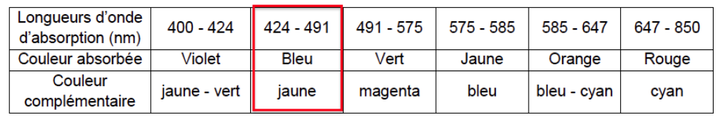 Longueurs d’onde d’absorption (nm)400 – 424424 – 491491 – 575575 – 585585 – 647647 – 850