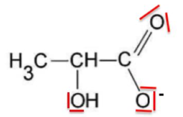 11. Représenter le schéma de Lewis de l’ion lactate, base conjuguée de l’acide lactique.