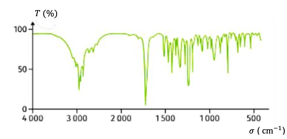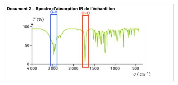 Le spectre présente une bande d’absorption autour de 1700 cm-1 caractéristique d’une liaison C=O et une bande d’absorption autour de 3000 cm-1 caractéristique d’une liaison O-H.