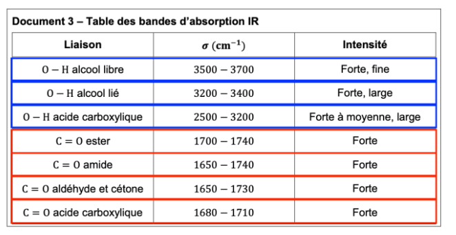 Le document 3 rappelle les caractéristiques d’absorption dans le domaine de l’infrarouge d’un ensemble de liaisons chimiques.