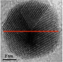1 – Vérifier que le nano-objet photographié au document 1, sur lequel les atomes sont clairement visibles, est bien une nanoparticule et que celle-ci relève de l’état cristallin.
