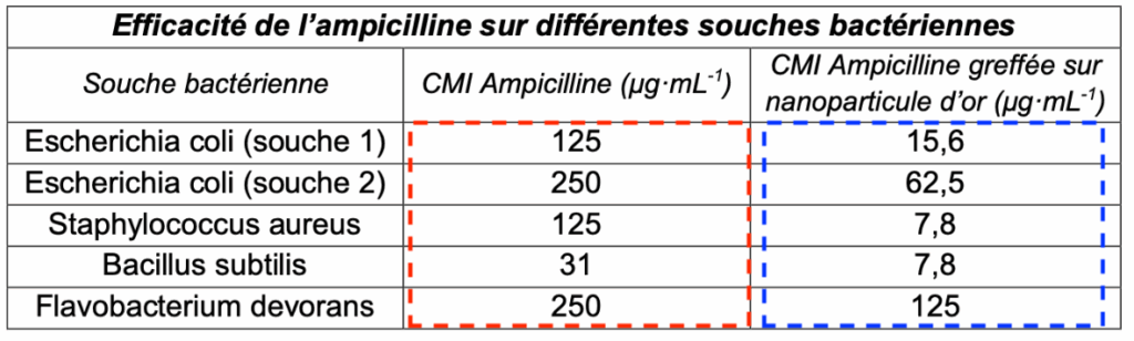 L’ampicilline est un antibiotique qui peut être greffé sur des nanoparticules d’or.