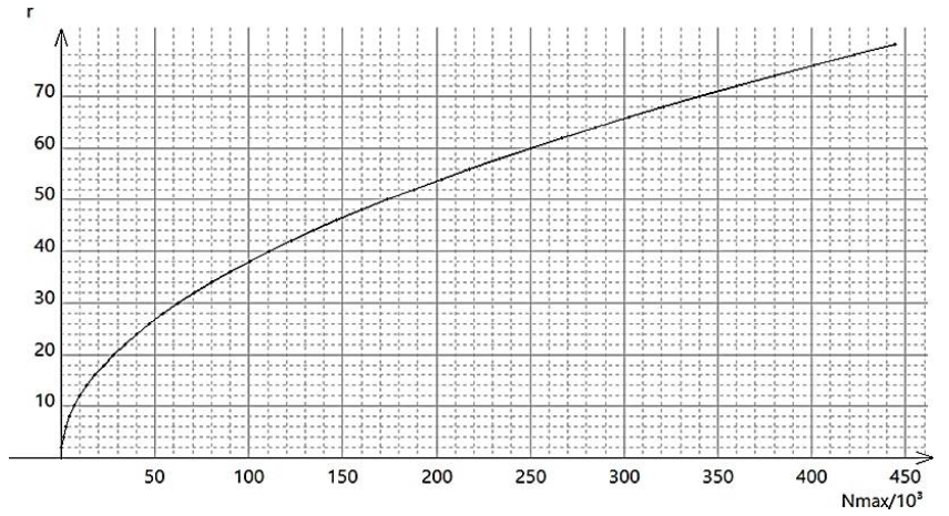 Graphique 2 donnant le rayon r de la nanoparticule en nm en fonction du nombre maximum Nmax d’atomes d’or utiles en surface : r = f (Nmax)