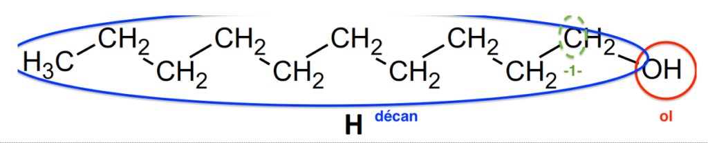 2.2. Le composé H est appelé décan-1-ol. Justifier son nom.