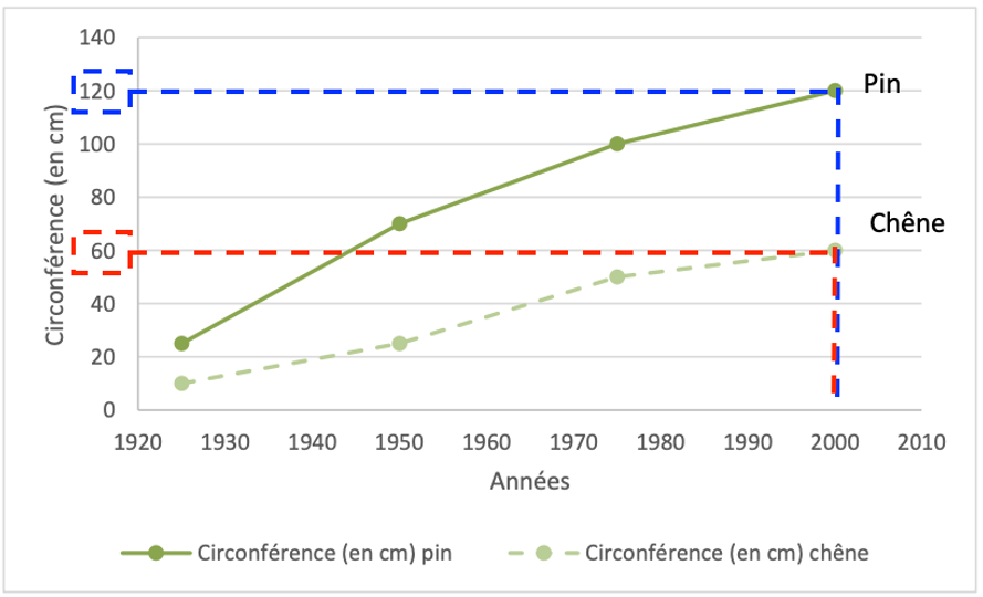 Le graphique ci-dessous représente la circonférence de pins et de chênes au cours du temps (après leur plantation en 1925).