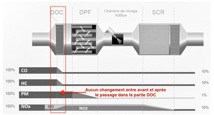 D’après le document constructeur décrivant le traitement des gaz d’échappement, le DOC est inactif sur PM : les particules fines.
