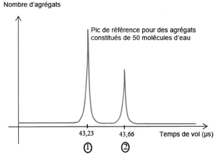 Lorsque l’on enregistre le temps de vol pour chaque agrégat qui arrive sur le détecteur, on obtient des résultats similaires à ceux donnés sur la figure 2 ci-dessous. Le pic principal, dit de référence, correspond aux agrégats constitués de 50 molécules d’eau.
