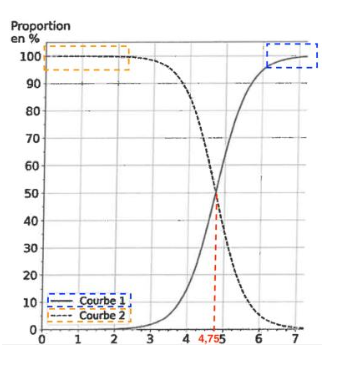 Lorsque $pH<{\rm pK}_A$, la forme acide prédomine.Pour $pH<{\rm pK}_A$ la courbe 2 est au dessus de la courbe 1.