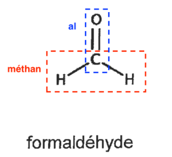 - en nomenclature systématique, les aldéhydes sont désignés par le suffixe -al.