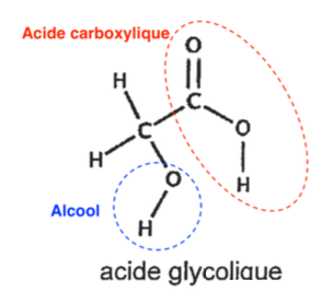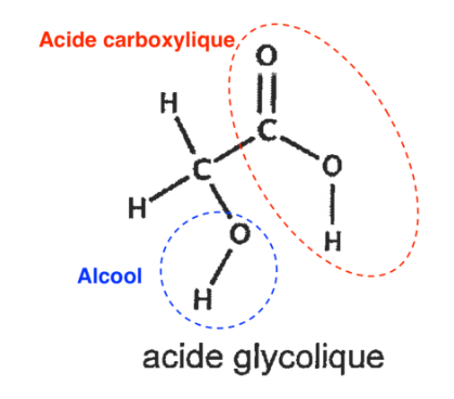 Q2. Recopier sur la copie la formule semi-développée de la molécule d’acide glycolique puis entourer et nommer les groupes caractéristiques présents dans la molécule en précisant les familles fonctionnelles associées.