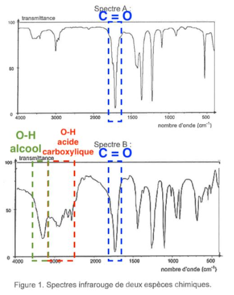 Q3. À l’aide des données, identifier parmi les spectres A et B de la figure 1 celui qui correspond à la molécule d’acide glycolique. Justifier la réponse.
