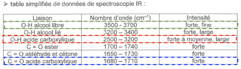 - Une bande correspondant à une liaison O-H acide carboxylique (nombre d’onde compris entre 2500 et 3200 cm-1)