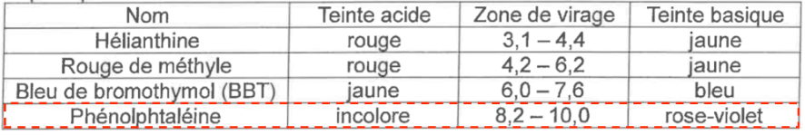 | Phénolphtaléine | incolore | 8,2 – 10,0 | rose-violet |