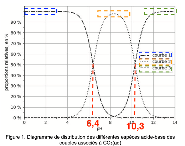 Q3. Expliquer, en justifiant, comment retrouver la valeur du pKA2 associée au couple HCO3(aq) / CO32–(aq) à l’aide de la figure 1.