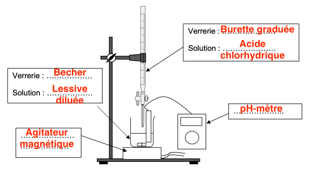 • prélever un volume de 50,0 mL de solution de lessive diluée puis réaliser son titrage par une solution d’acide chlorhydrique de concentration cA = 1,0×10–1 mol·L–1.
