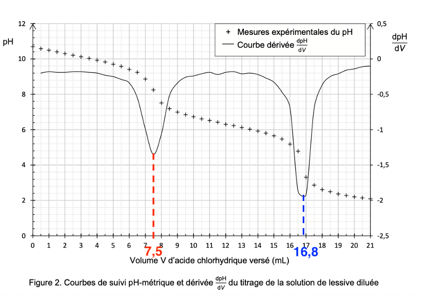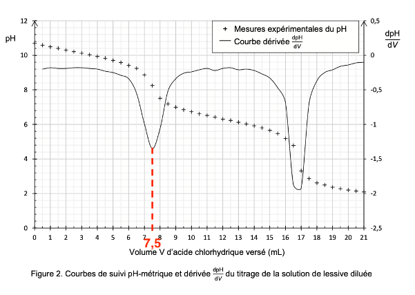 La courbe du suivi pH-métrique de ce titrage ainsi que celle de la dérivée sont données en figure 2 ci-dessous.