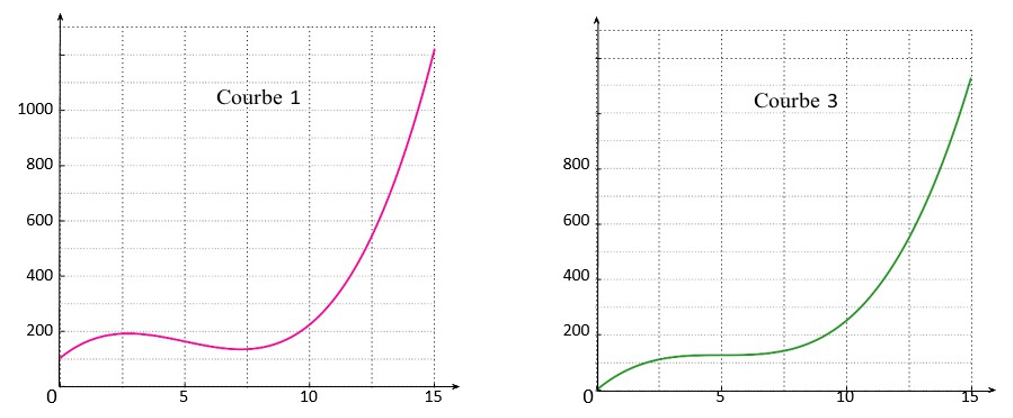6- On donne sur la page suivante quatre courbes dont l’une est la représentation graphique de la fonction 𝐶 sur [0 ; 15].