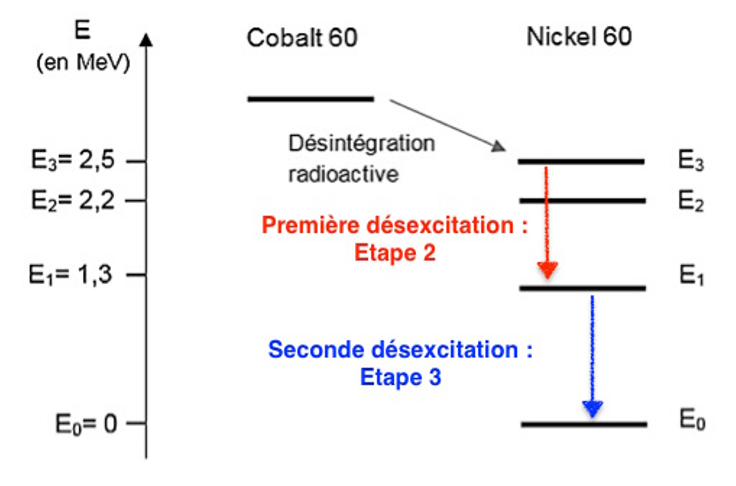 - 1ère étape : en subissant une désintégration radioactive le Cobalt 60 se transforme en du Nickel 60 à l’état d’énergie E3 ;