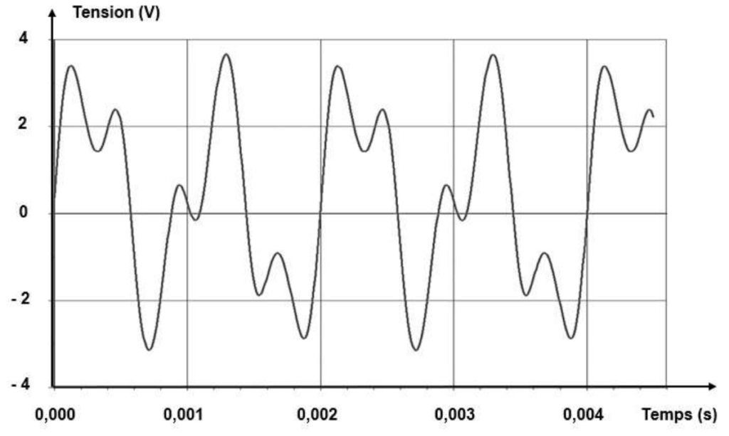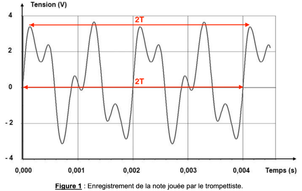 B.1. À partir de la figure 1, déterminer la fréquence 𝑓 de la note émise par le trompettiste en explicitant la démarche.